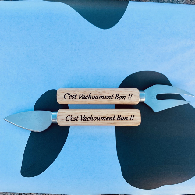 Service à fromage (couteau, fourchette) OLaVache "c'est Vachoument Bon!" ou personnalisé (sur demande)