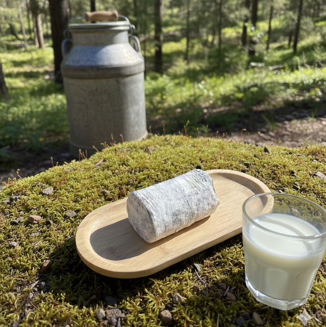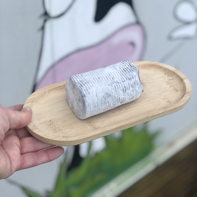 Bûche cendrée au lait cru* de vaches, poids d'environ 150g suivant affinage. En fonction du stock il vous sera proposé une bûche cendrée fraiche ou affinée.