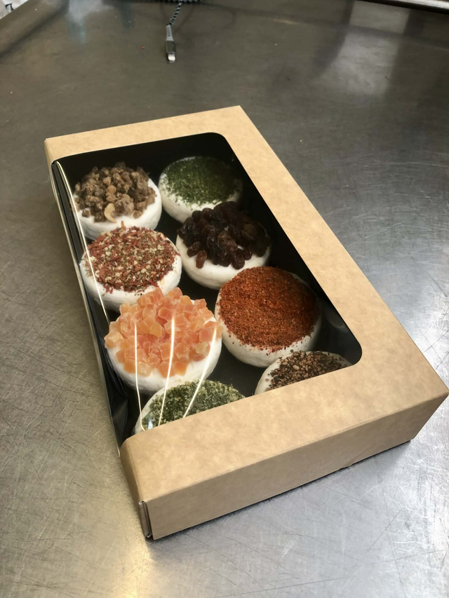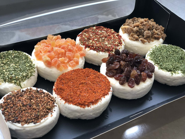Vachous Party: fromages au lait cru* se présente sous la forme de 7 vachous aromatisés** (cabécous) + 1 vachou surprise (découverte d’une saveur surprise). Poids d’un vachou 50g.